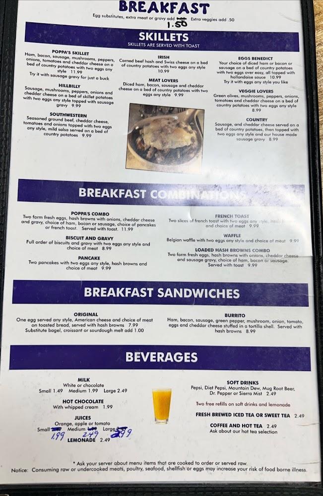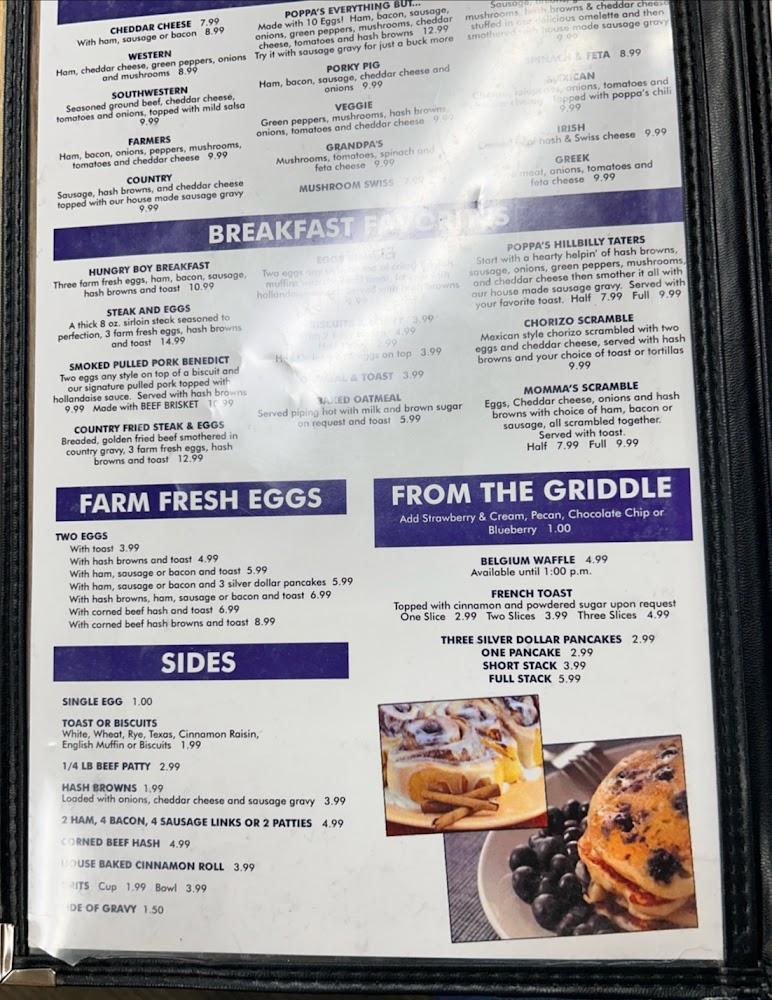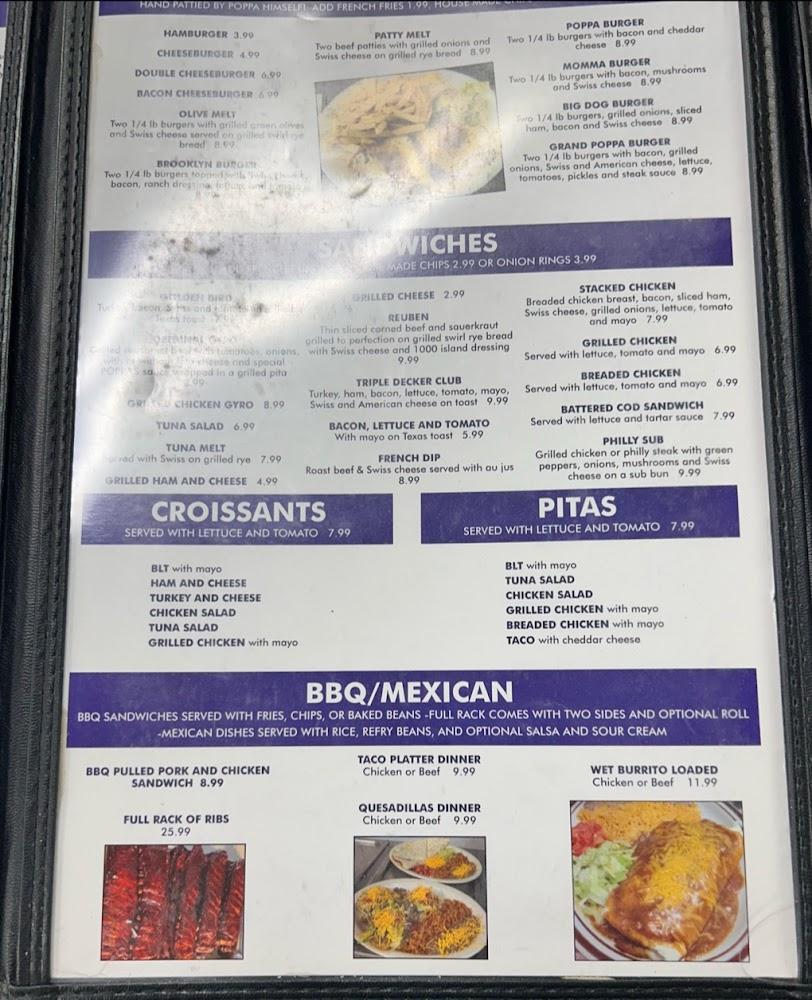 Poppa's Place offers a diverse menu filled with comfort food favorites. Breakfast shines with options like eggs, pancakes, and various skillets. For those looking for lunch or dinner, sandwiches, burgers, and specialties like fried chicken await. Daily specials include homemade soups and fresh salads, appealing to various tastes. The drink menu includes refreshing beverages, catering to different preferences. Portions are generous, satisfying even the hungriest of diners. All dishes focus on quality and flavor, making it a popular choice for many. Culinary highlights include the local specialties and comforting dishes enjoyed by patrons.
